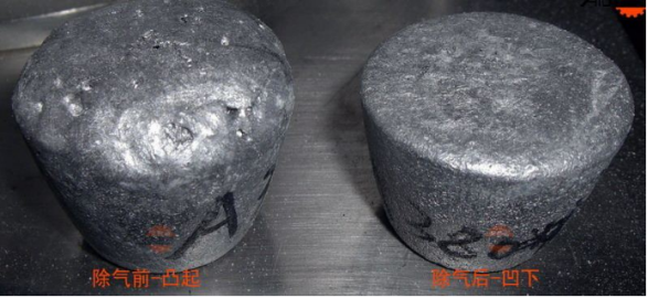 1. 仔细观察其试样顶部表面,这是常用又快捷的一种方法。经过抽真空的铝液试样经过适当冷却后,如果顶部出现呈菜花头形状,或至少有些隆起,则说明含气量较多。反之,如果顶部面平滑或略有凹陷,则表明含气量较少,由此可判断是否可以浇铸。